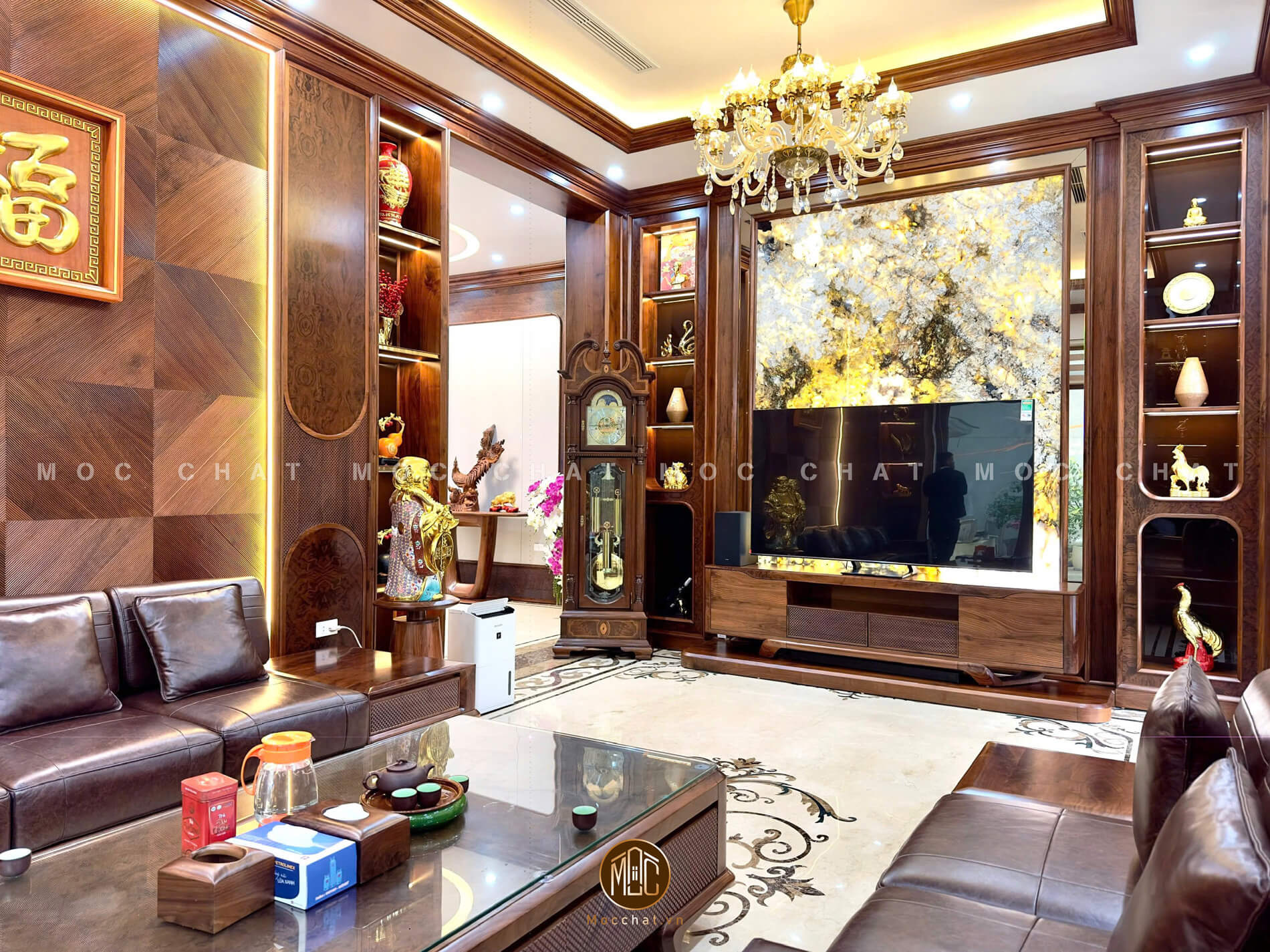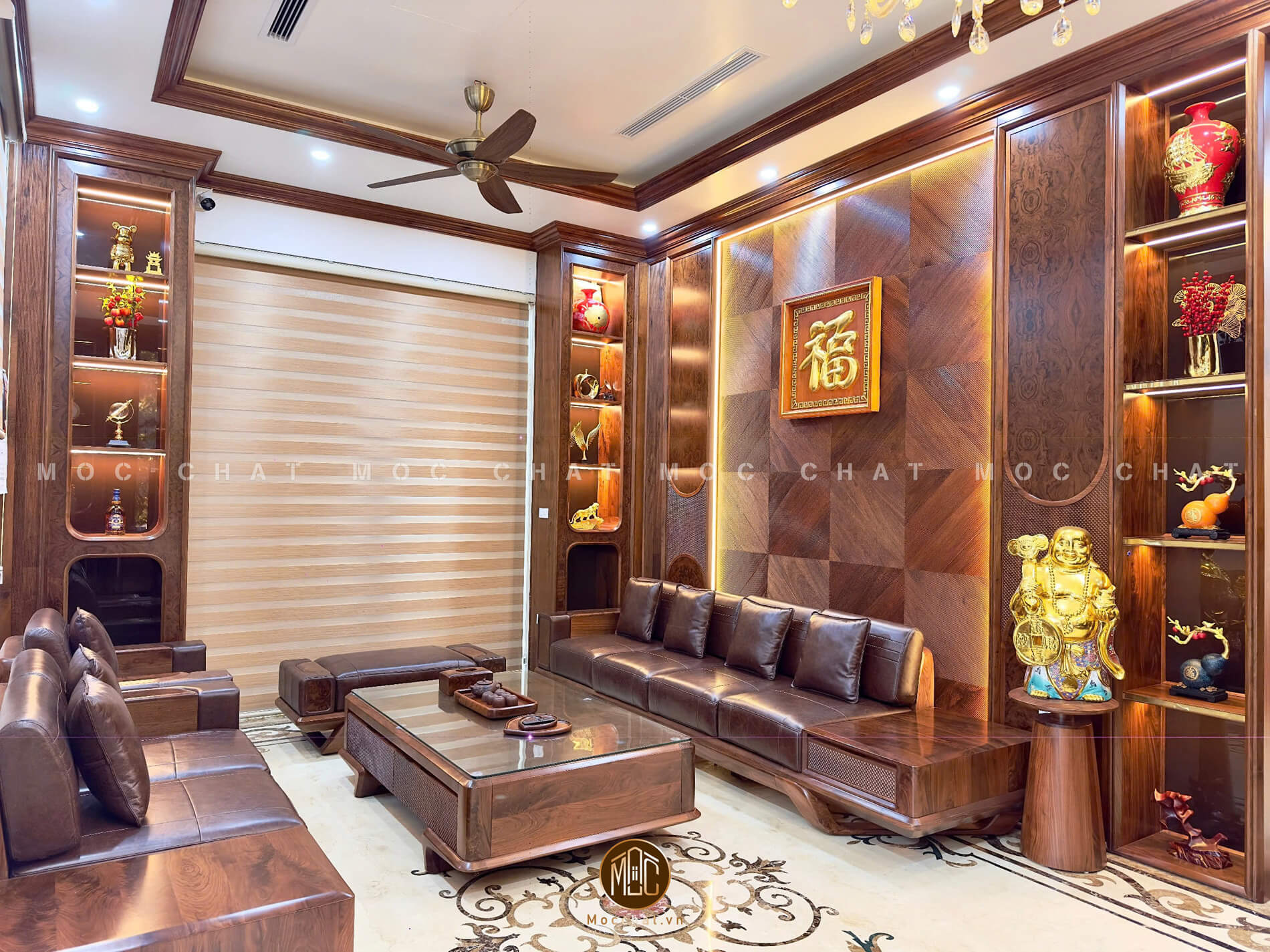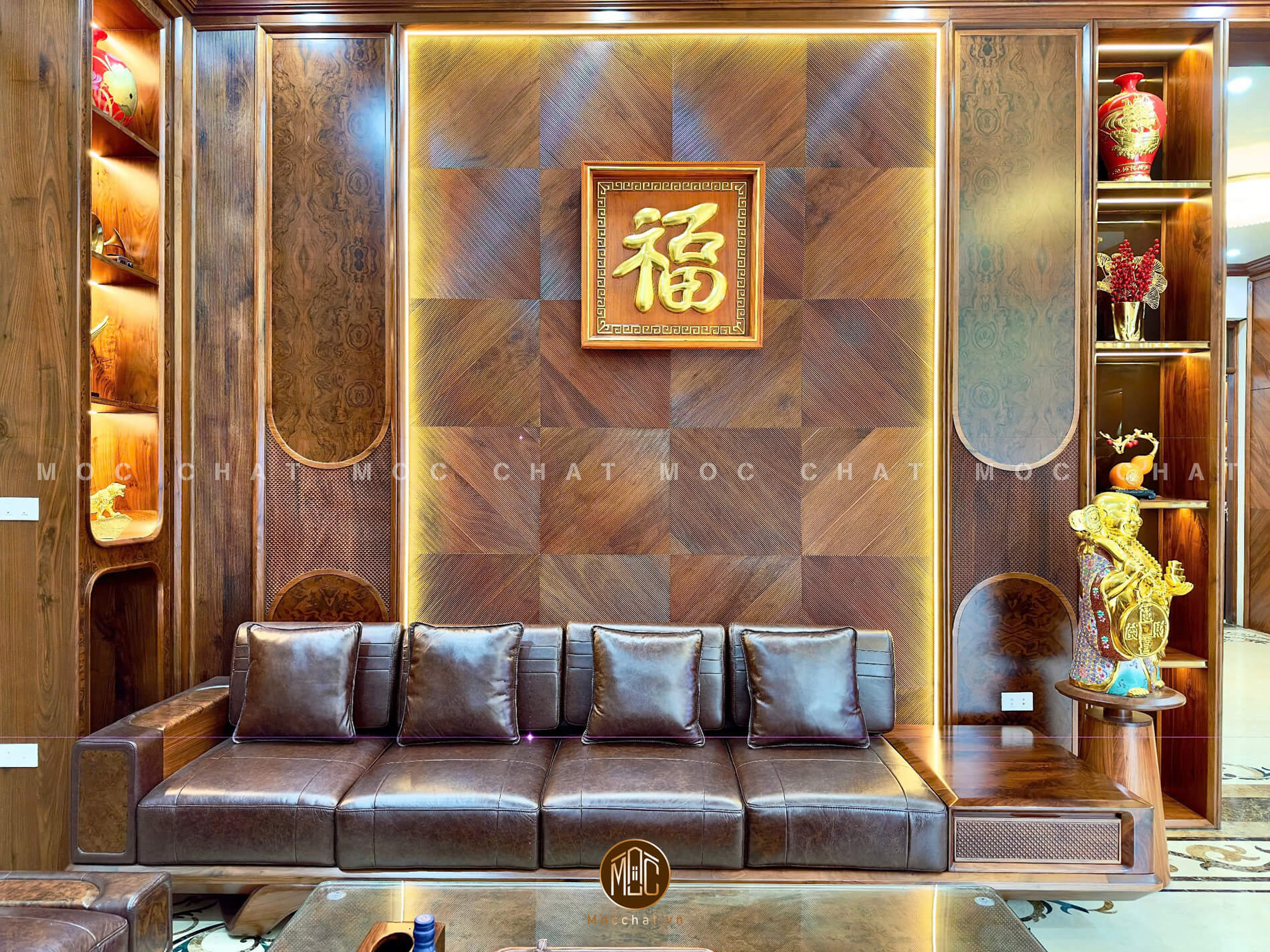 Nội thất phòng khách gỗ óc chó cao cấp với sofa chữ U sang trọng (nguồn: mocchat.vn)