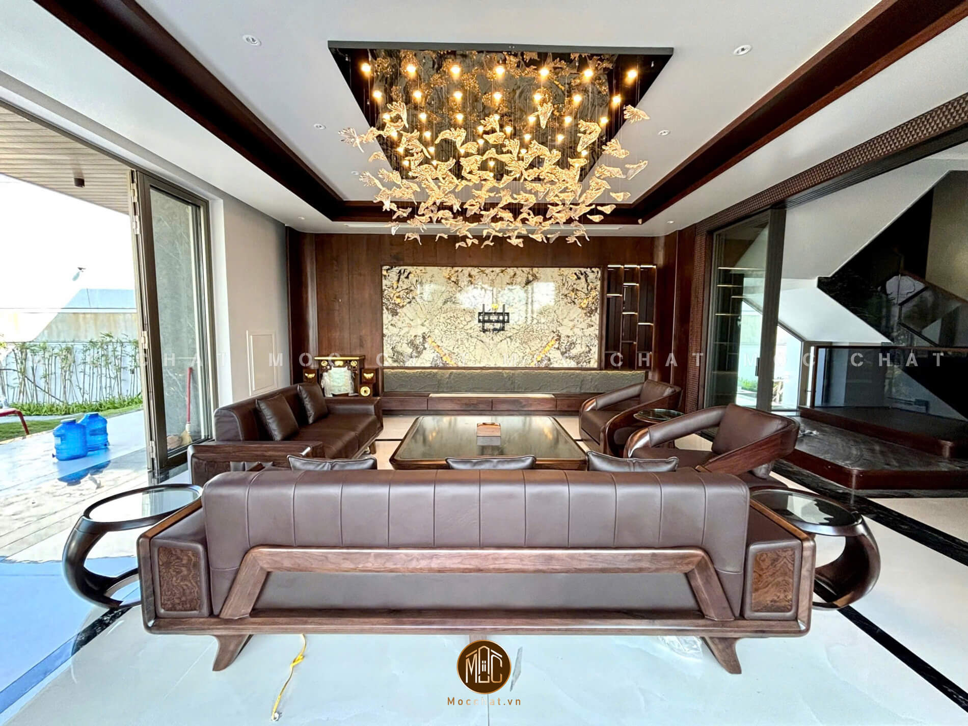 Bộ sofa gỗ óc chó thiết kế đẹp mắt cho phòng khách mở hiện đại (nguồn: mocchat.vn)